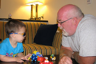 Joshua was so thankful for his sunglasses and didn't want to take them off...even in darker rooms. He & Papaw are buddies. They talked on the phone and Joshua repeated everything Papaw would say (including asking if he wants a hot dog and then saying "Noooo, silly!").