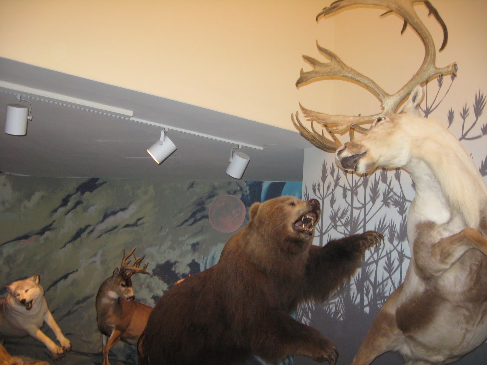 On Tuesday, Mom & I took the boys to the North Museum. She had seen a coupon in the newspaper for $1 off admission, and it advertised the Big Bird Planetarium. One of my friends had mentioned that show being cool for little ones, and I had seen at the library where they had a free family guest pass for admission. Shawn had reserved the pass a couple weeks ago, and it finally came in! The pass was good for up to six people, including Ma-maw, and they still honored our $1 off coupon (since the planetarium costs extra). The entire bill for all four of us was $1.50 (since Caleb still gets in for free). The first display we saw was the bear above, and the boys wanted to go behind the ropes to get him. The next thing we saw was the potty - which is on a different floor than the main attractions. We were there three times for the Bean, who obviously had a little too much to drink before we left.