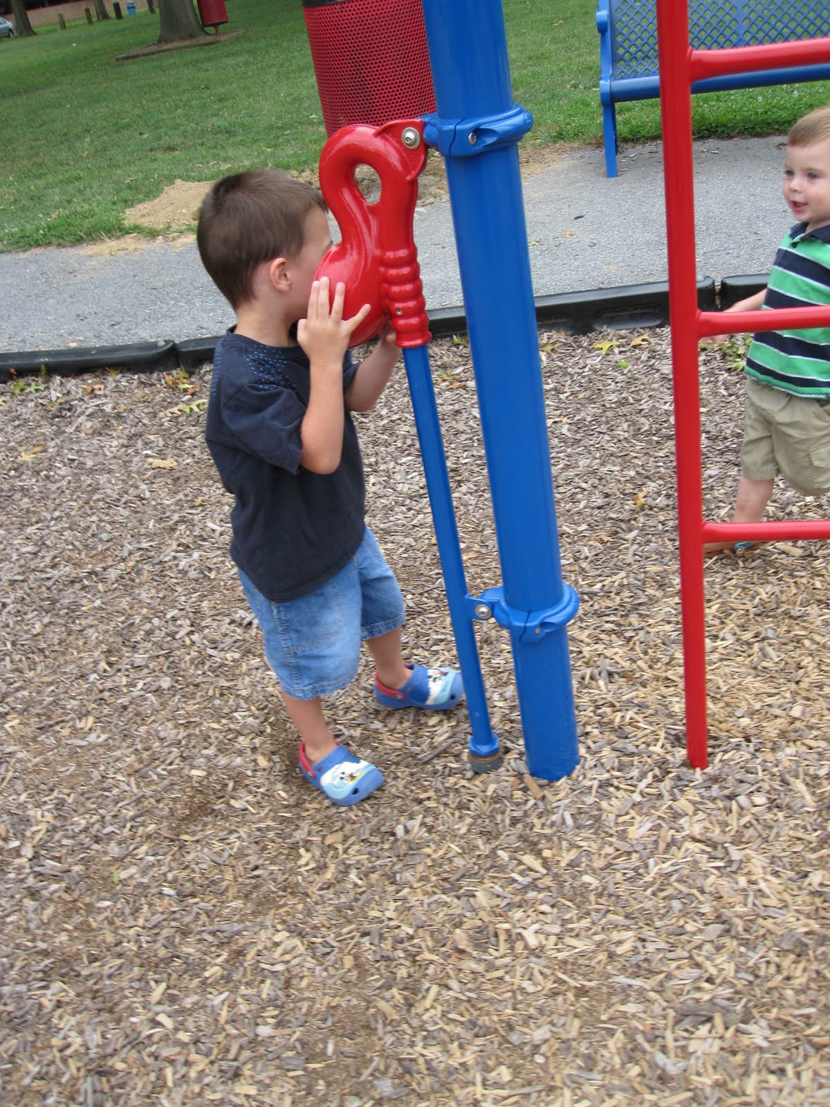 In the meantime, Joshua headed to the playground which was right next to the pavilion so we could see him as we were working. He LOVED the seesaw. His only problem was that he weighs so much less than all his cousins, so they didn't have much fun playing when it was his turn. He loves Emma, who's on the other side.