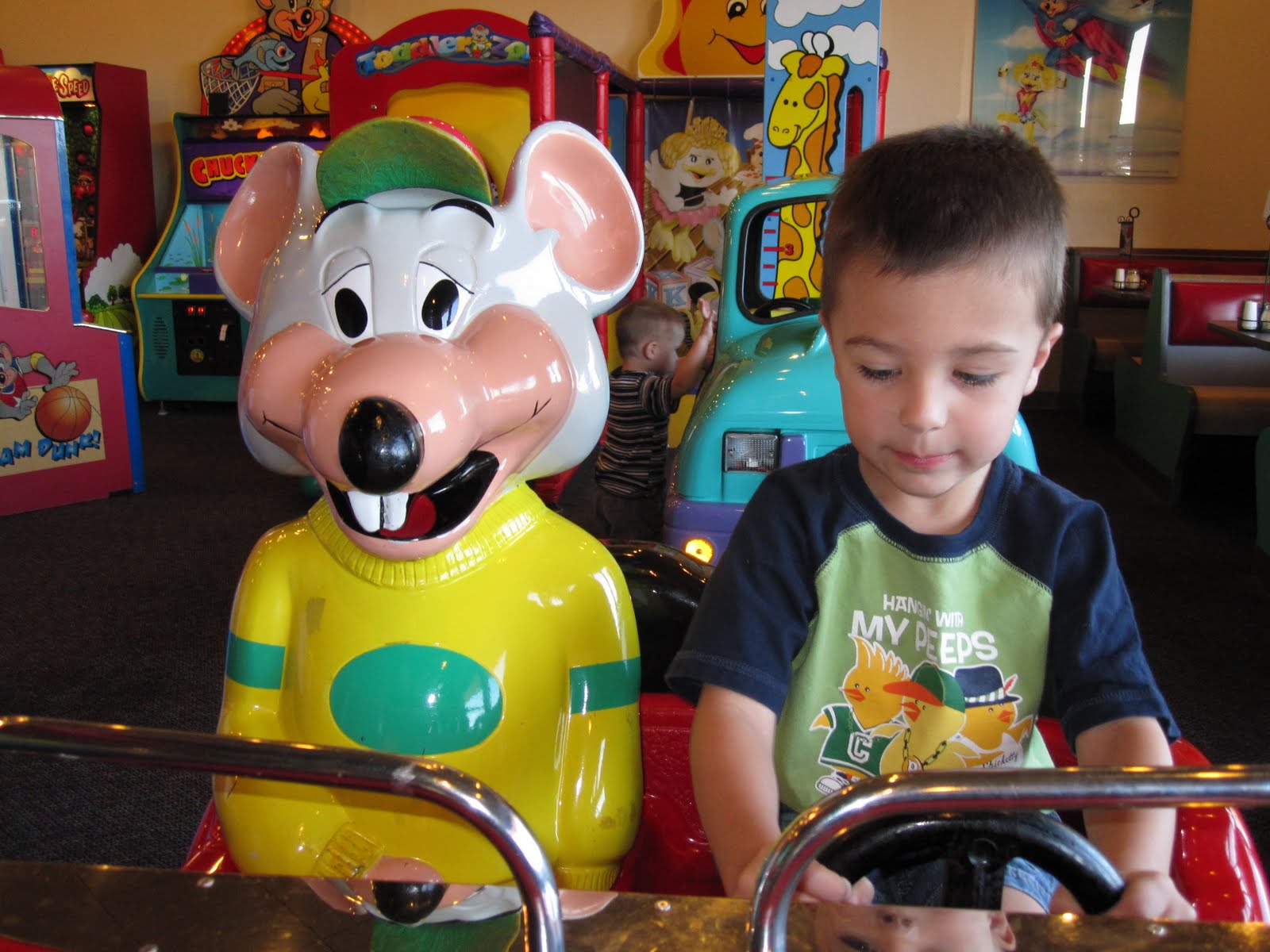 On Wednesday, Caleb's 26-month birthday, our friends invited us to Chuck E. Cheese. We didn't have plans that night, so we said sure. [Earlier that day, Caleb & I had went grocery shopping while the Bean was at preschool and then we went to Aunt Jen's house for lunch with Grandpa Georgia and the kids played outside in her backyard.]