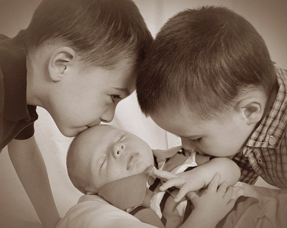 The boys are intrigued by their baby brother and both are extremely sweet to him. Joshua will tell him it's okay when he cries, and both boys will give him gentle kisses when I say it's okay.