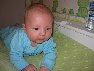 By four months, Ryan should be rolling. It gives me something to work on with him. Although, he already goes to his side immediately when on his belly, so I don't think it should be an issue. :) I love my pudgy little guy! I love his smile and his big cheeks and double chin. Even the pediatrician noted that he looks much bigger than the last time she saw him. :) The outfit he's wearing in these pictures says "If you think I'm cute, you should see my Daddy." It's a 6-9 month that Joshua was given (that said, it ran a little small as I recall, so I'm glad I got it out for Ryan now).
