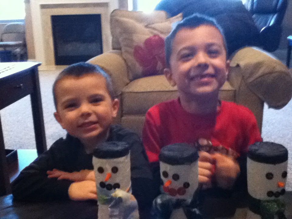 The boys love their little snowmen! We gave one to Mamaw to keep in her basement with her other winter decorations. We have more tissue paper and bottles, so we may even make more this winter, if we would get any snow especially. It's been relatively warm this winter, but that's great with us! We can have fun with our homemade snowmen rather than the God-made kind. :) :) :)