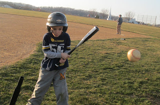 Joshua's first t-ball practice was Friday, April 5, at Nitrauer. While it had been warm during the day, by the time we got there, the wind had picked up and it was FREEZING! But he still refused to wear the zippy I brought for him.